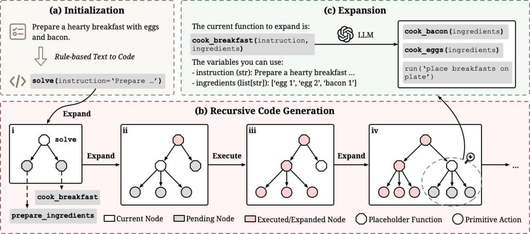 基于这个洞察,ReCode 提出了一个优雅的解决方案: 用统一的代码表征来表示所有决策,无论粒度粗细。 高层计划表示为占位符函数,低层动作表示为可执行函数,然后通过递归机制将前者逐步分解为后者。